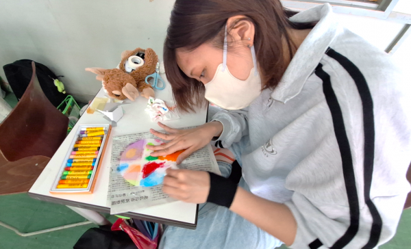 クレヨンを塗ってティッシュでこする作業を繰り返して