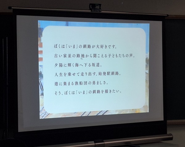 介護環境科2年の城川さんは「弟子屈出身で就職も地元に戻るが、木島先生の絵を通して、釧路にはこんなにきれいな景色がたくさんあるんだと知った。また釧路に遊びに来たらきれいな景色巡りをしたい」と話し、感謝の気持ちを伝えていました。