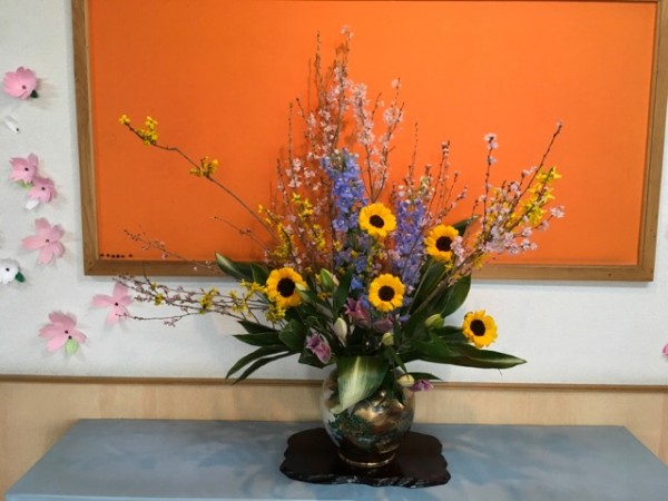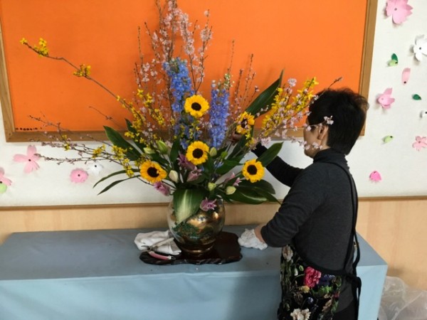 介護環境科『芸道』の授業の中で、伝統文化への理解や対象者の生活の豊かさに寄与できる支援方法について教えて下さる佐藤瑠美子先生。毎年入学生を迎える式花を自ら活けて寄贈して下さっています。〔お花の世界に携わり約60年の瑠美子先生。流派は未生流です〕