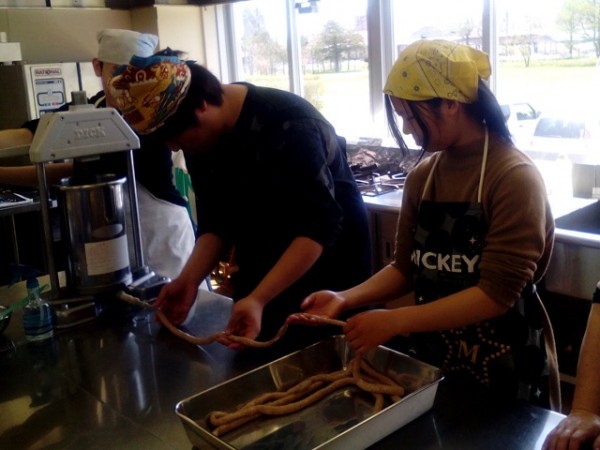 ソーセージづくり:挽肉をこね、香料を入れ、本物の腸を使って詰めていきます。出来たてのソーセージはとても美味でした!