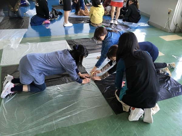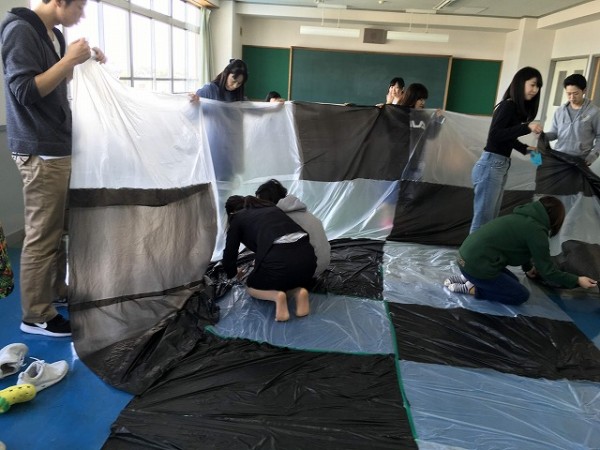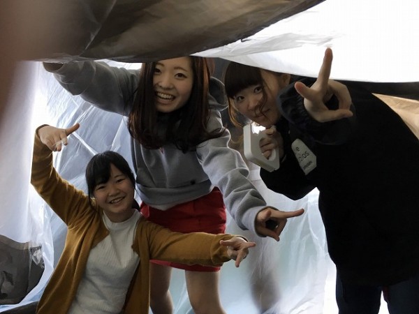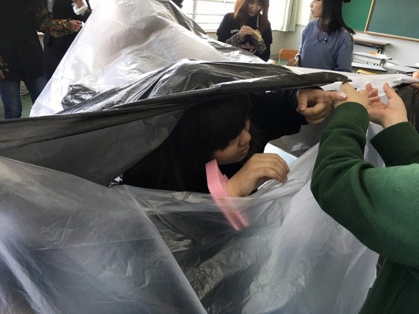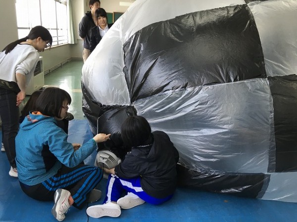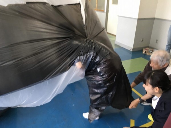 身近な素材のポリ袋をつないで、大きなエアドーム「ふわふわドーム」を作りました。