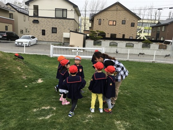 朝の自由あそび、ちゅうりっぷ組はお外へ。爽やかな空気の中、こども目線で一緒に遊びます。