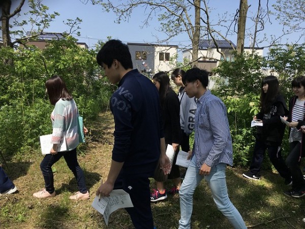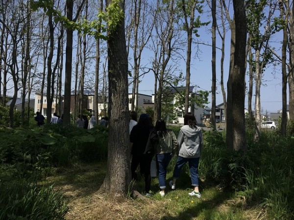 森の中を散策する学生たち。