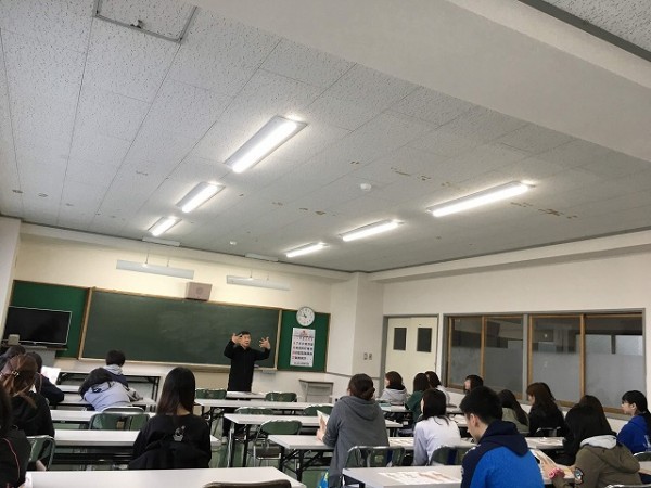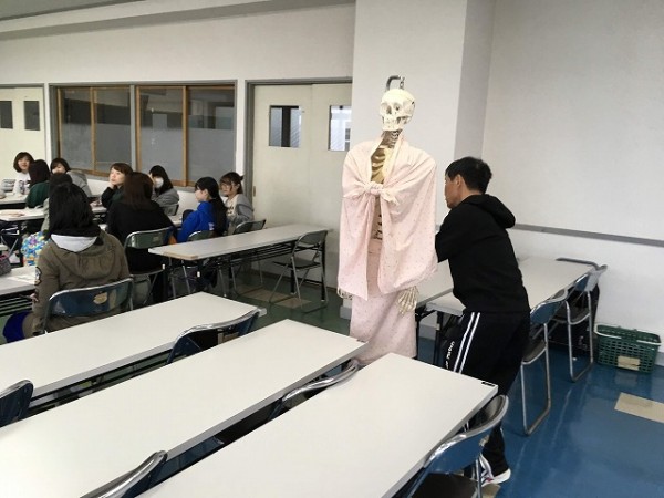 前半、石田先生の筋肉の仕組みや役割・働きの詳しい解説を聞く学生。