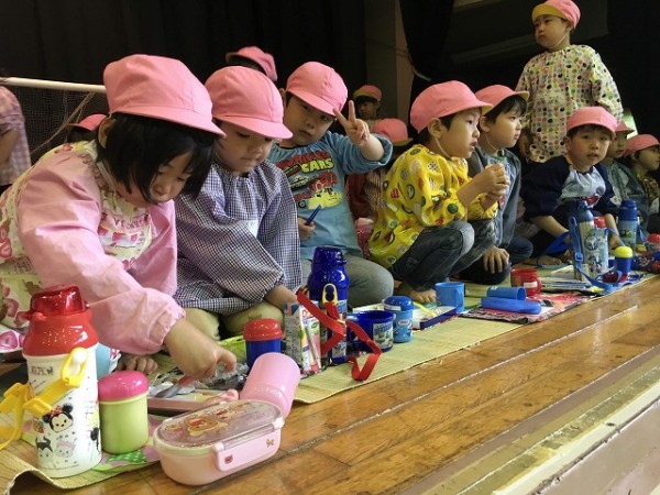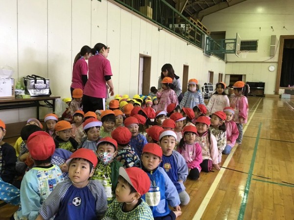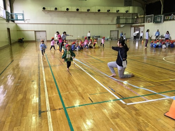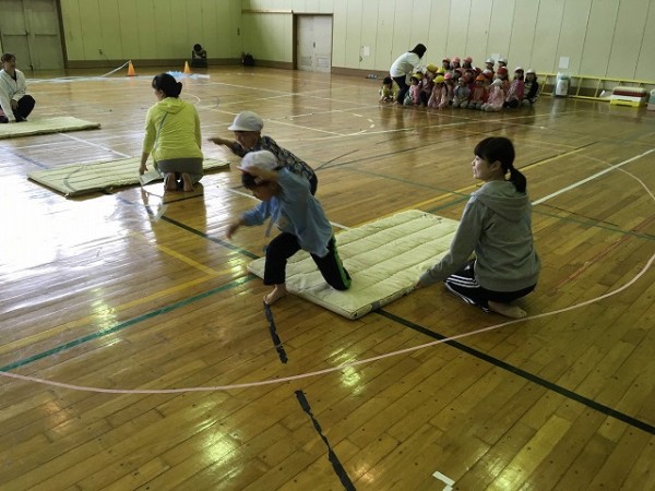 1グループ目は愛国スレンドようちえんです。総練習当日はお天気が悪かったため、学校の体育館で行いました。学生は園児係りや道具係りとして体験実習を行い、こどもたちと直接ふれながら園行事を学びました。