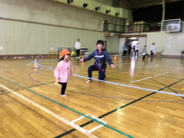 クラス対抗リレー。頑張る園児さん。ガンバレ、ガンバレ、応援しながら見守る学生。