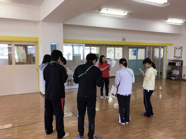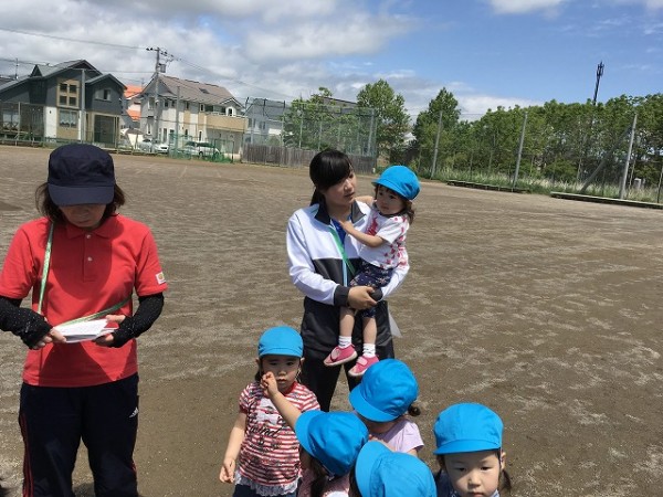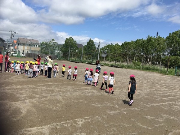 担当クラスに分かれて保育に参加した後、園児さんたちと昭和小学校のグランドへ向かいます。