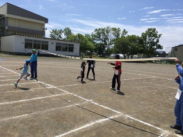 ゴールで見守る学生。ゴールした子を誘導します。頑張ったね!