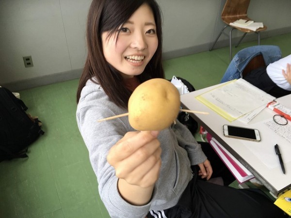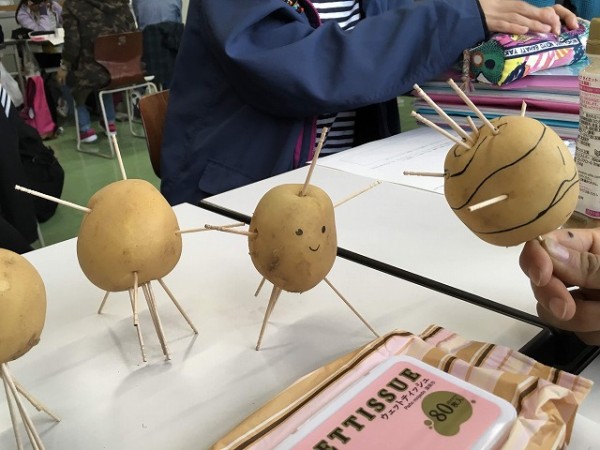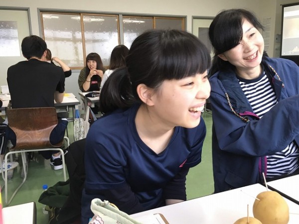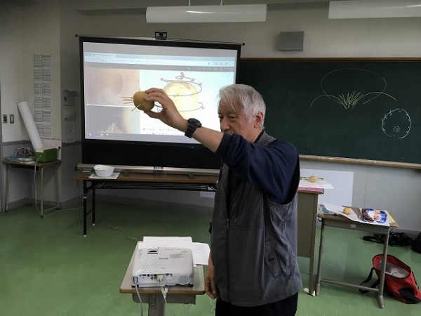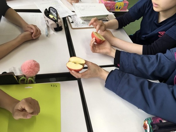 この日の授業は「植物の視点から考えてみよう!」ということで、倉賀野先生が用意してくださった果物や野菜のおしべとめしべの痕跡を探すことから始まりました。