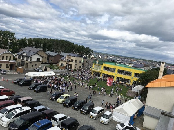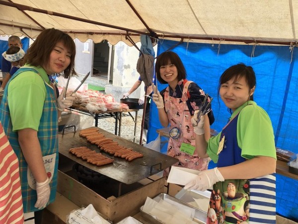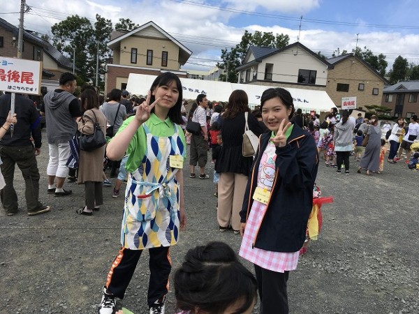 この日は長雨の後の爽やかなお天気でした。会場となった学校横の駐車場とわかばフレンドようちえんの園庭は、3園の園児さんや保護者の皆さまで大賑わい。こども環境科1年生は夏休み中でしたが学生がボランティアとして参加し、会場係りや出店係りのスタッフとして夏祭りを盛り上げました。