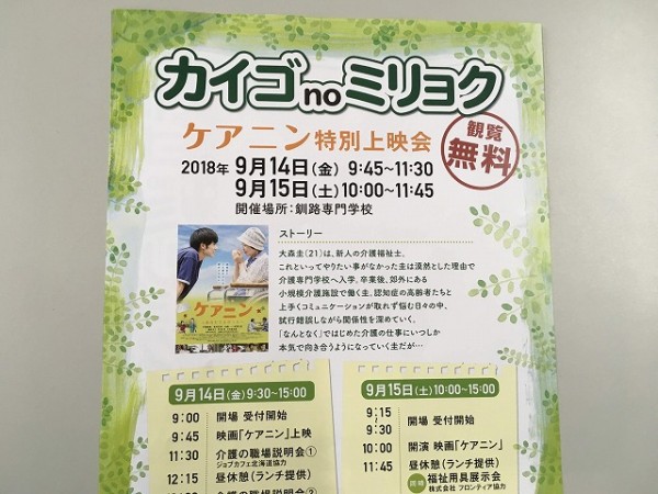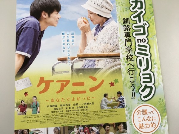 本校では、多くの皆さまに介護の魅力をもっと知って貰おうと映画「ケアニン」の上映会を二日間に渡って開催します。
