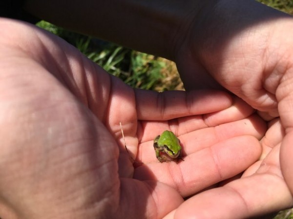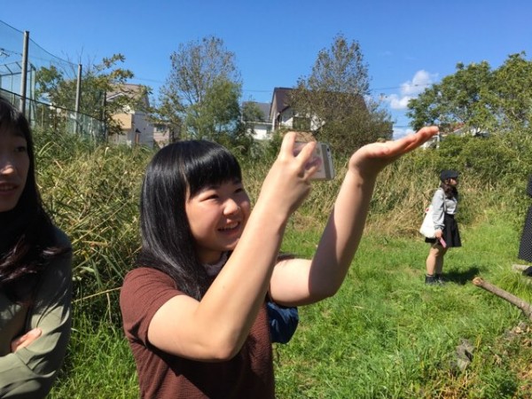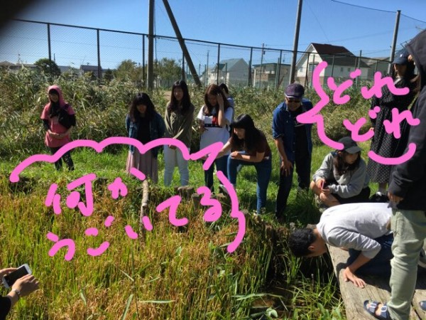 森の奥には小さな池が。学生が動く物を発見!何とおたまじゃくしでしたよ。