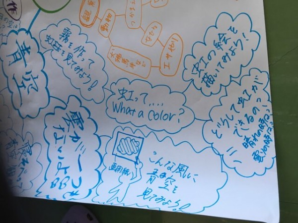学校へ戻り、振り返りの授業 ウェブ作り。グループワークで関連キーワードを想像していきます。
