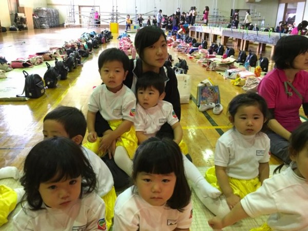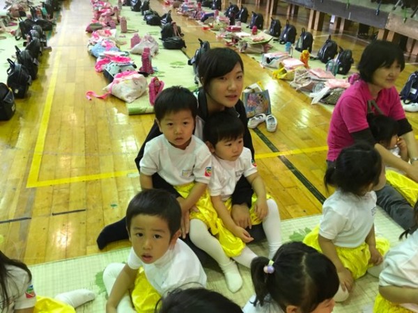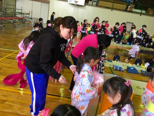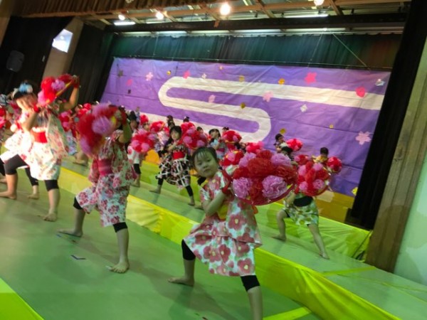 園児たちと共に学校の体育館へ移動します。小さい組さんでは年長さんの踊りを一緒に見学します。「お姉さんたち 頑張って!」