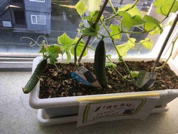室内のプランターでは、こんなにりっぱなきゅうりが実りました。毎日少しずつ成長したのですね。
