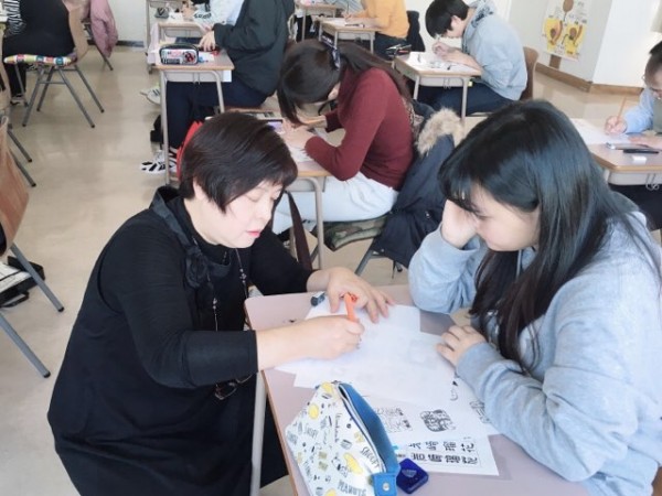 芸道(書道・茶道・華道)の授業もあります。高齢者と向き合う仕事なので、知識を役立てたいです。(写真は書道の消しゴムはんこ)