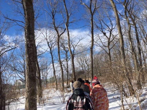 学校の近郊にあるビオトープの森へ向かいます。冬の森は一面雪景色。白い息、裸んぼの木々、キュッキュッという長靴の音。