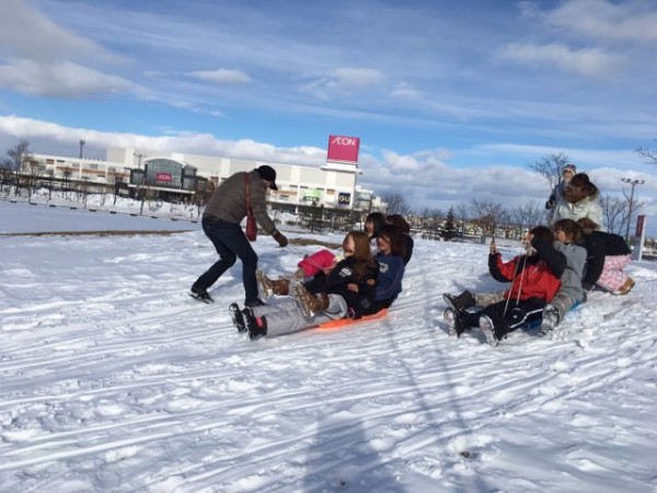 公園の雪山でソリ遊びを展開。ビニール袋でも滑りましたよ。