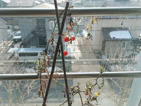 保育ゼミで育てているミニトマトの木。厳しい寒さに耐えるほどトマトの甘みが増すことを自然を通して学びました。