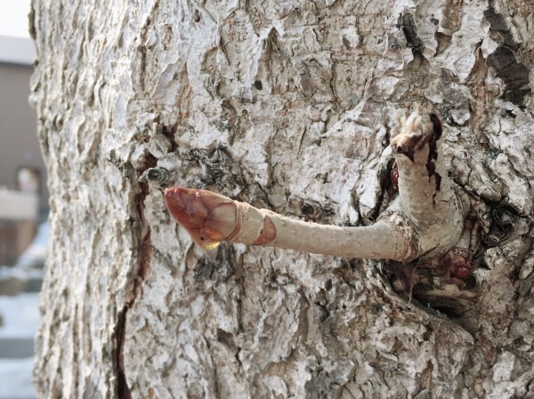 マロニエの木に近ずいてみると、木の芽の先端には樹液が滴り、長い冬のエネルギーに感動!