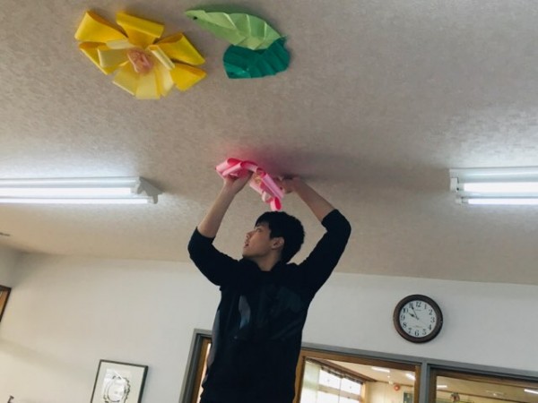 玄関の天井飾り。背の高い男子学生が頑張って飾ってくれました。玄関を通る時、ちょっぴりだけ目線を上に上げてみてください。朝夕心がほっこり和みますように💓