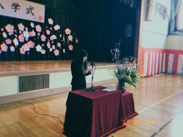 在校生の代表として歓迎の言葉を述べた松崎さん。「不安になった時は私たちや先生方に声を掛けてください。必ず力になります」と力強く温かいメッセージを披露してくれました。