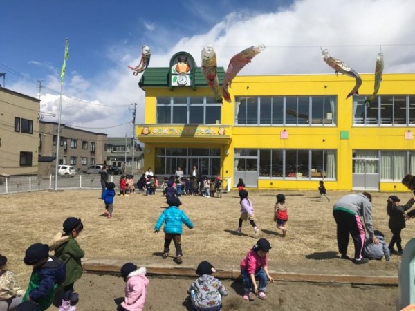 早春の寒さにも負けずに元気に遊ぶこどもたち。