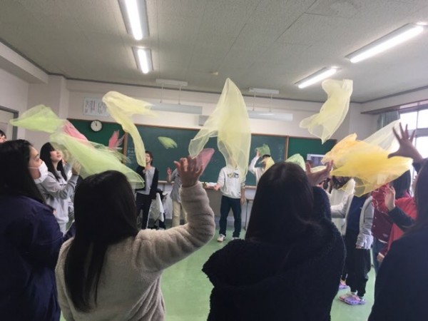 空へ向かい一斉に投げ上げると、ヒラヒラと落ちていきます。上手に受け取れるかな(^-^)