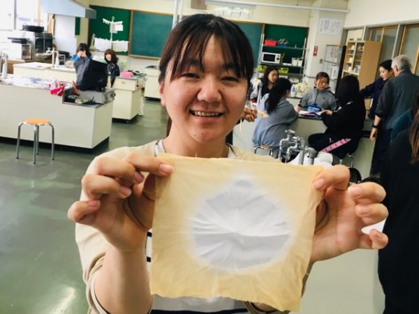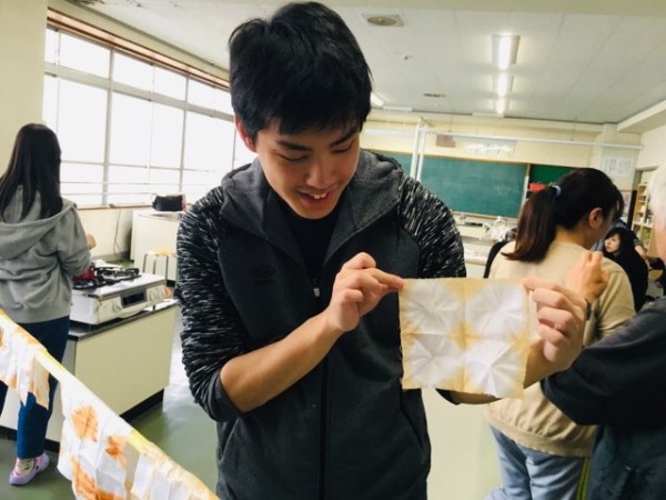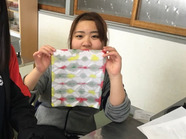 この日の授業は『染め』に着目して教育方法の実践を行いました。まず学生は半紙を自由な形に折ります。