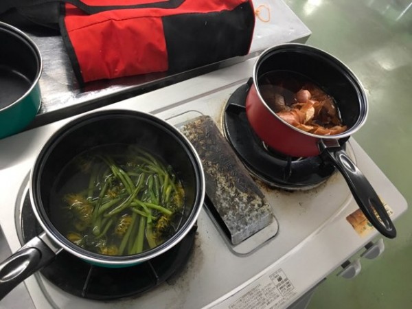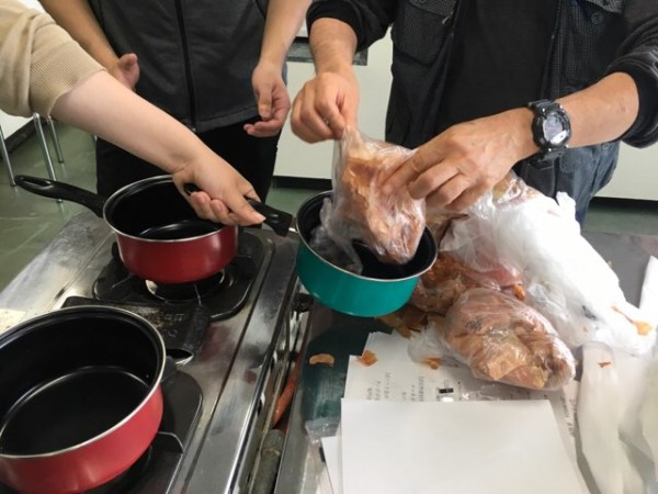 次に自然素材を利用して絞り染めを行なっていきました。これは布を使って染めます。まずは玉ねぎの皮を煮立てて染め汁を作りました。