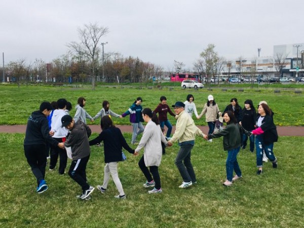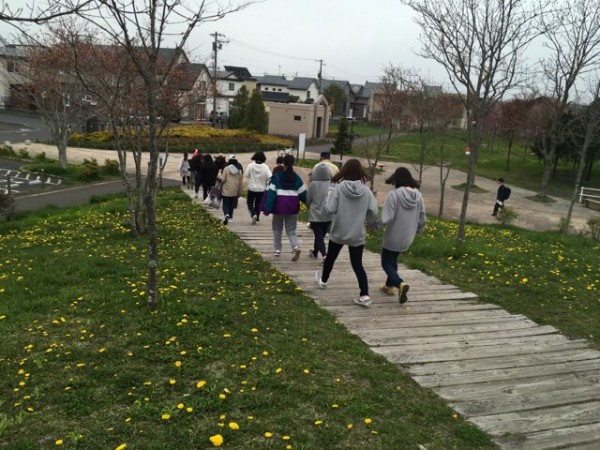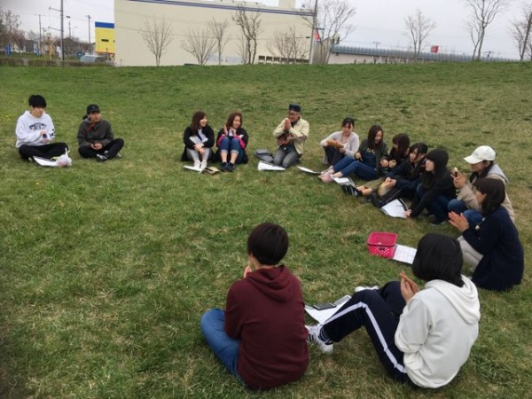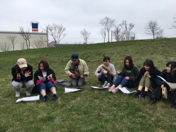 楽器を持参した学生たちは、緑の中で「小さな世界」を合奏しました。先生のウクレレ、リコーダーやタンバリン、カスタネットのミニ音楽隊の優しいメロディーは、春の風に乗り自然の中へ溶けこんでいきました。春まだ浅い肌寒さが残る日でしたが、自然の中で季節を感じることの大切さを感じた一日でした。、