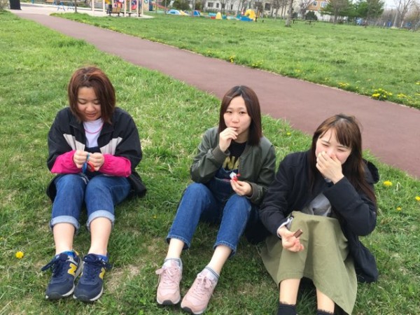 耕一郎先生からおやつを貰い、嬉しそうな学生。お外で食べるおやつは格別です!