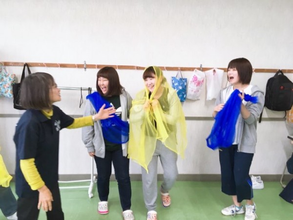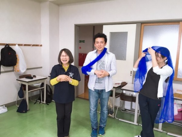 半透明で柔らかな素材のスカーフはいろいろな遊びへ応用できます。変身ごっこや見立て遊びはもちろん、引っ張りっこやボールの変わりにしたり、ハンモック状で遊んだり、目の前にかざすと瞬時にファンタジーの世界へ。ムーブメント教具を使っての遊びは無限大へ広がっていきます。そこには笑顔とファンタジーと愛があふれていました。障がいがある人も無い人も一緒に学べる環境をめざして。ここから未来!