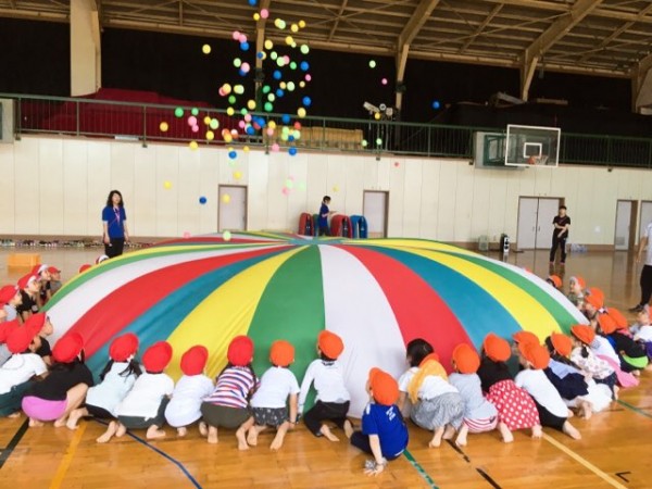 遊戯ではパラシュートを使い、全員で力を合わせ演技します。1人でも力を惜しむと、こんなに綺麗なドームは作れません。ここまで来るためにたくさん練習したことでしょう。学生はお母さんみたいな気持ちで見入ってしまったそうです。園児さん達に大きな拍手‼️
