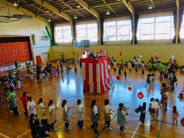 人形劇終了後、盆踊りを再開しました。いつもはわかばフレンドの園庭で開催される夏祭りですが、今年は台風の影響で急遽学校の体育館で行いました。