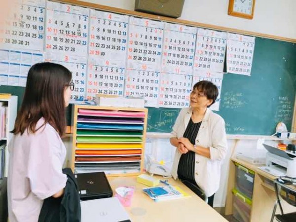話に花が咲く卒業生と田仲先生。田仲先生は卒業生が勤める同じ法人の園長先生もしていました。