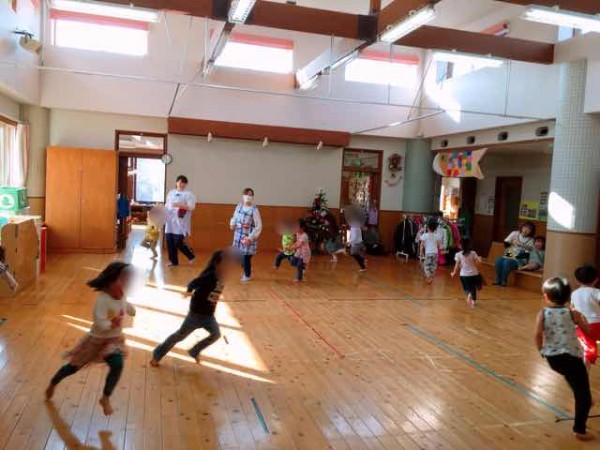 4歳児はリズム表現遊びを楽しんでいました。プレイルームいっぱいにこどもたちの歓声が響き渡ります。どんぐりの家保育園では2ヵ月毎に標茶町の石窪夫妻をお招きしてリズム表現遊びを展開しています。