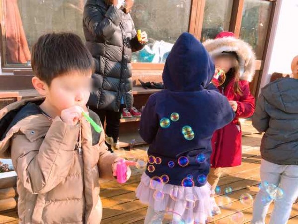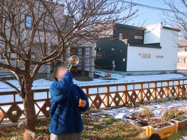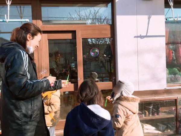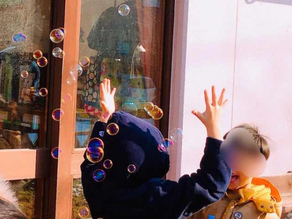 5歳児クラスではシャボン玉遊びに取り組んでいました。前日までの寒さが嘘のようなポカポカ陽気に恵まれたこの日。こどもたちは教室南側に設置されたテラスで、シャボン玉遊びを存分に楽しみました。