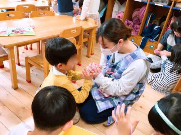 園に到着した学生は、自分が希望した年齢のクラスに入り、自由遊びに参加しました。