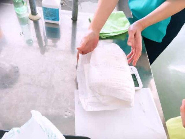 おむつってこんなに重いの? 演習で用いた水分を吸ったおむつ。処理する前にその重さを体感しました。