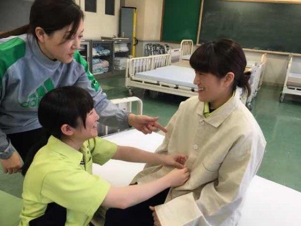 2年間に渡り幅広く学んでいく生活支援技術。どのカテゴリーでも必ず利用者役と介護者役に分かれてロールプレイを行います。特に利用者役を経験することで、寄り添う気持ちが理解でき、学びが深まったそうです。