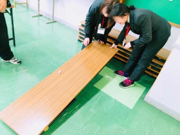 始めは長机を使い、転がしていた生徒さんたち。互いにコミュニケーションを取りながら、どうやったら長い坂を転がし続けられるのか考え、話し合い、協力して坂を造り出し連続させるという解を見出しました。