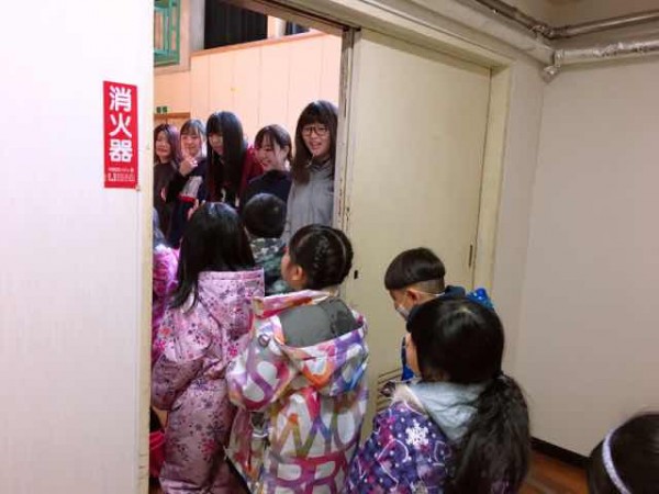 会場は体育館です。寒さに負けずに元気に来場して来る園児たちを笑顔で迎える学生たち。