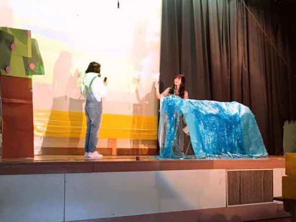 トップバッターは2年生の劇『金のおの銀のおの』。授業中に市立図書館に行き、教育的メッセージが込めらたこの絵本を選びました。