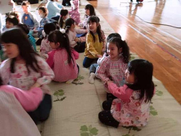 この日は系列フレンドようちえんとめぐみ幼稚園の年長組の幼稚園児(約170名)が集い、劇や人形劇を観覧しました。
