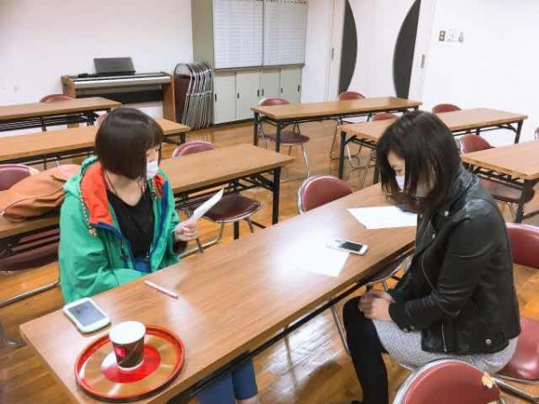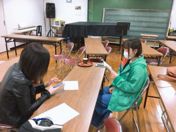 約束の時間の30分前から登校して、原稿読みの練習に取り組んでくれた柳原さん。さすが。本校の特待生です。