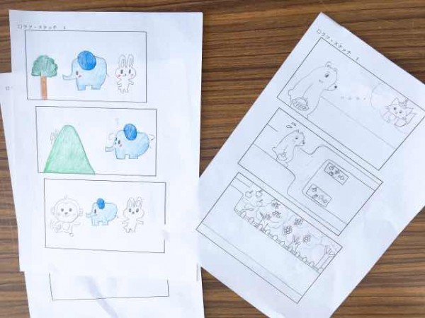 まだ2回目の授業にも関わらず、家で作業して来たのか、絵本の下絵がチラホラ。学生はとても意欲的に受講していてびっくりしました。きっと奥田先生の自由でのびのびとした芸術表現が、学生の創作意欲を燃やしているのですね。
