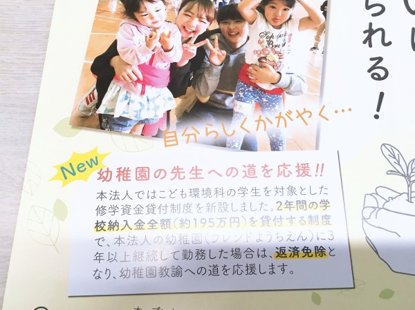 今年度新設したこども環境科の修学資金貸付制度。興味のある方は上記バナーをタップしてみてください。系列のフレンドようちえんで3年間働くと2年間の学校納入金全額(195万円)が免除される大変画期的な制度です。