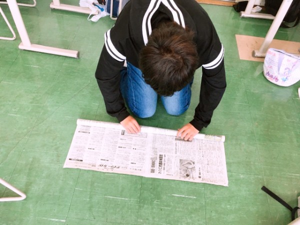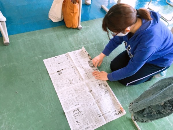 まず、一人一枚の新聞紙を丸めていきます。