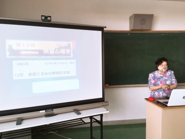 今日紹介するのは2年生の教育心理学。講師は発達心理学を担当してくださっている北海道教育大学教授の福岡真理子先生。一年次に発達心理学で習得したこどもの発達と理解を振り返りながら、保育現場での教育や保育効果を高めるために、より集団保育に着目した知識や技能を身につけることを目的とした授業を行なっています。